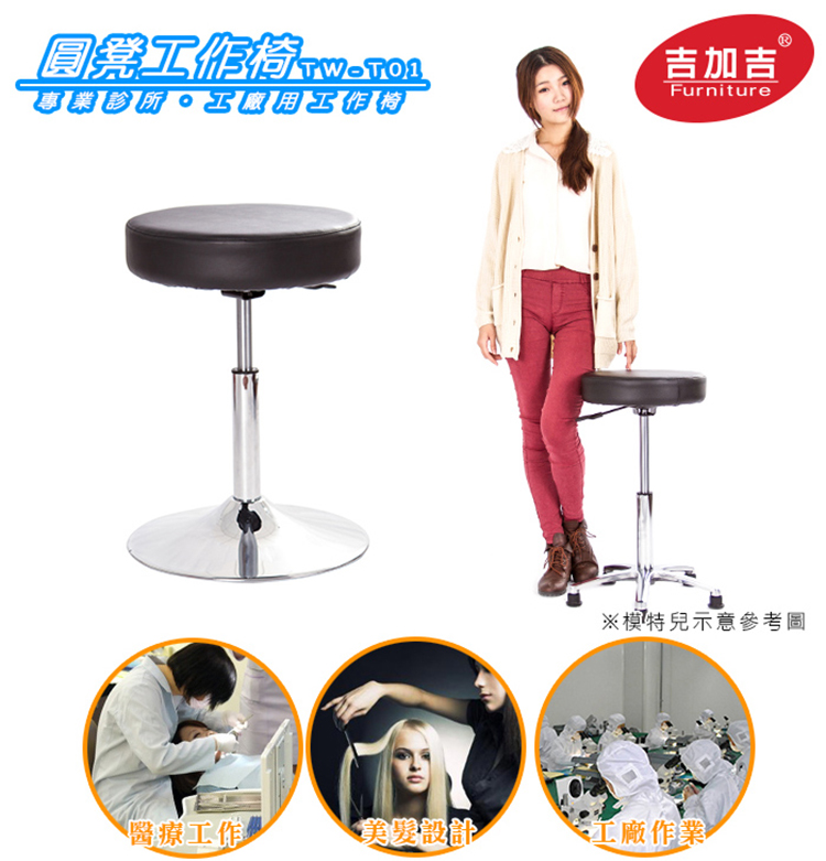 TW-T01圓凳工作椅,為工廠、診所使用,方便長時間工作作業使用,或詢問門診病患,功能單純方便,功能單純方便,簡約質感。