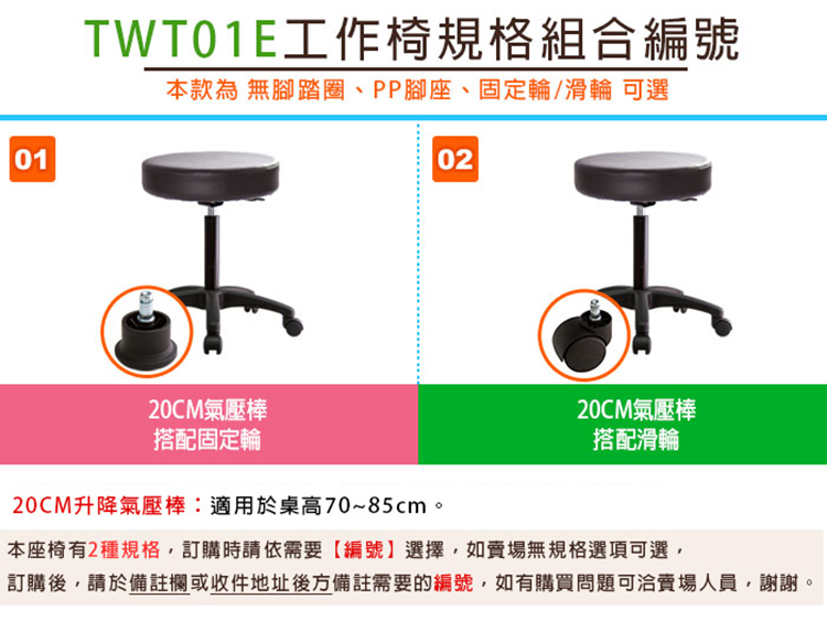 本款使用工作型氣壓棒,20CM升降氣壓棒,使用一般桌面70-85CM,針對製造業、加工廠業者設計, 且使用台灣工廠製造,氣密度好,不易漏氣損壞,或發生氣爆的危險,安全無虞,可放心使用。