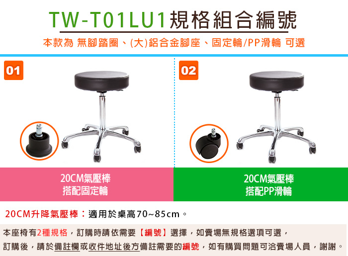 本款有兩種輪組可選,訂購前請注意,固定輪(不會滑動,輪子為平面),一般PP尼龍輪(可推動,若工作環境為木質、大理石地板,建議加購升級PU輪、或至五金百貨店買腳座布套,避免地板刮傷)。