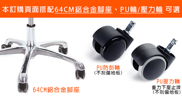『PU壓力輪』:椅子承重時,輪面會因重量下壓固定不滑動;椅面沒有重量時,保有『一般滑輪』作用方便滑動,不傷地板。
