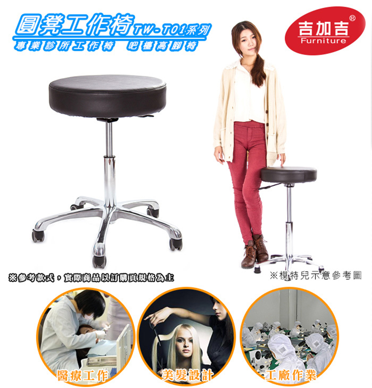 TW-T01圓凳工作椅,為工廠、診所使用,方便長時間工作作業使用,或詢問門診病患,功能單純方便,功能單純方便,簡約質感。