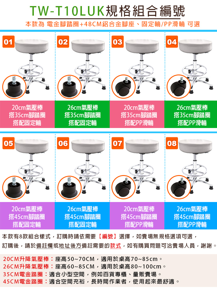 8.座面高度決定於氣壓棒使用長短,請選擇適當高度,若需求較高高度,建議加長氣壓棒尺寸,避免高度不夠,將氣壓棒升到最高,容易造成氣壓棒損壞。