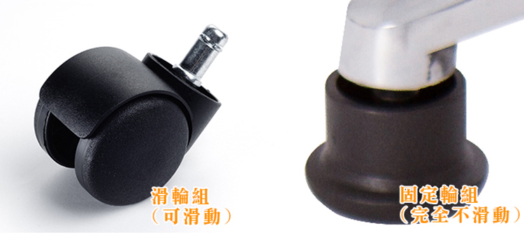 本款有兩種輪組可選,訂購前請注意,固定輪(不會滑動,輪子為平面),一般PP尼龍輪(可推動,若工作環境為木質、大理石地板,建議加購升級PU輪、或至五金百貨店買腳座布套,避免地板刮傷)。