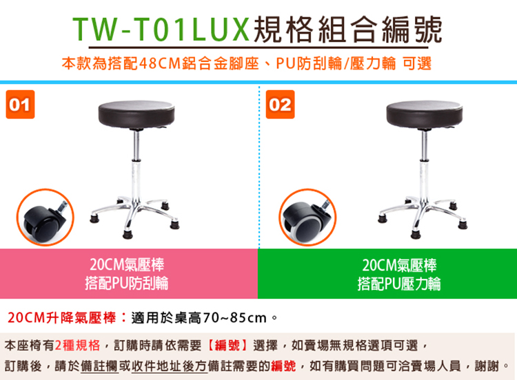 本款使用工作型氣壓棒,20CM升降氣壓棒,使用一般桌面70-85CM,針對製造業、加工廠業者設計, 且使用台灣工廠製造,氣密度好,不易漏氣損壞,或發生氣爆的危險,安全無虞,可放心使用。