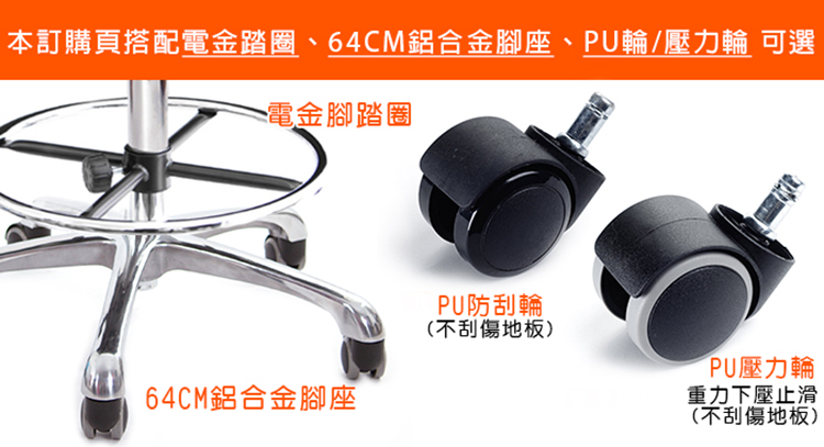 『PU壓力輪』:椅子承重時,輪面會因重量下壓固定不滑動;椅面沒有重量時,保有『一般滑輪』作用方便滑動,不傷地板。
