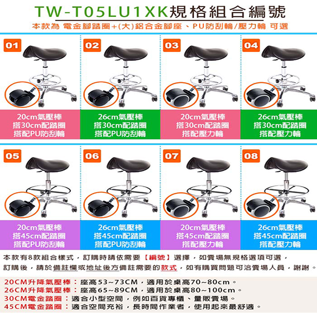 本款TW-T05馬鞍椅系列,為工廠、診所、美髮業者...等使用,針對長時間工作使用,方便使用者在移動,常會將自身重心左右、前後擺動,