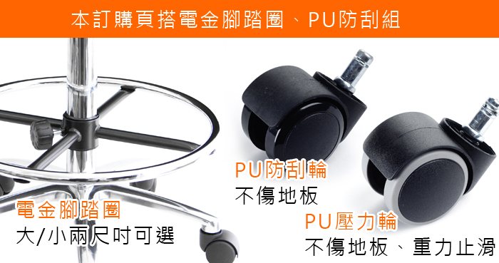 本款使用『PU壓力輪』:椅子承重時,輪面會因重量下壓固定不滑動;椅面沒有重量時,保有『一般滑輪』作用方便滑動,不傷地板。