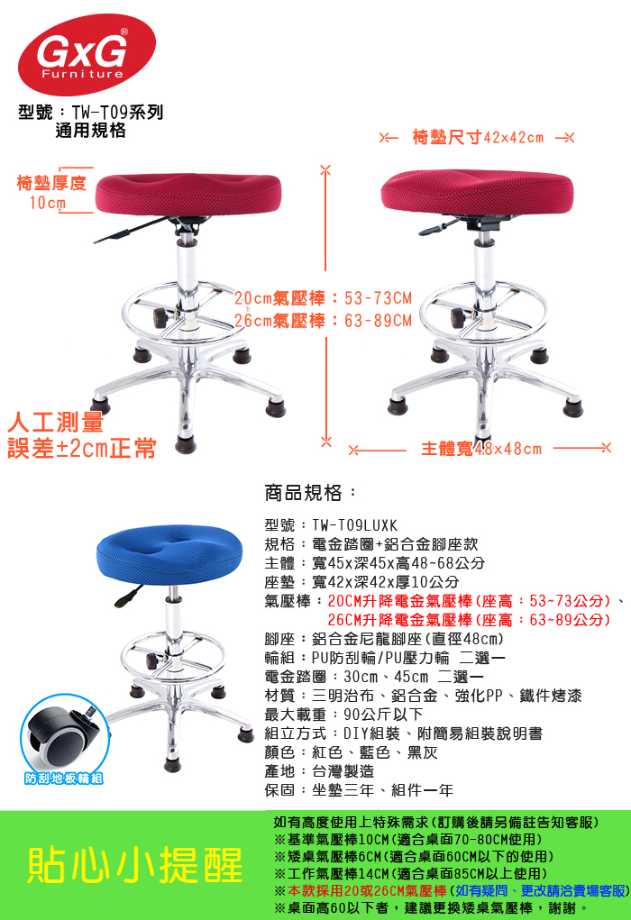 8.座面高度決定於氣壓棒使用長短,請選擇適當高度,若需求較高高度,建議加長氣壓棒尺寸,避免高度不夠,將氣壓棒升到最高,容易造成氣壓棒損壞。
