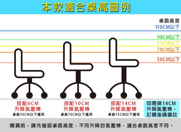 ※購買前,請先確認桌面高度,不同升降的氣壓棒,適合桌面高度不同,